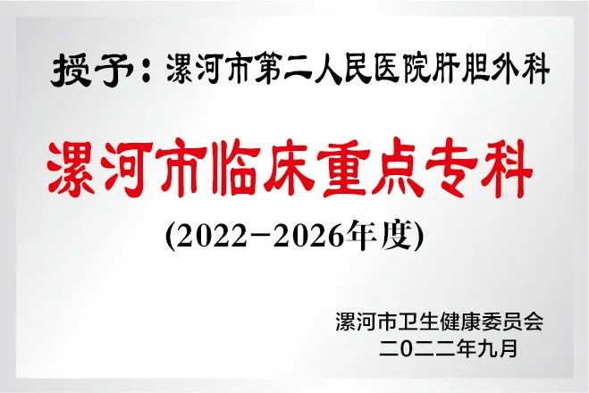 漯河市第二人民医院普外科含肝胆外科、烧伤科、泌尿外科、微创外科、普外科。其中肝胆外科为漯河市医学重点专科,拥有普通病床46张,重症监护病床5张,该科技术力量雄厚,现有主任医师3人,副主任医师2人,住院医师3人,副主任护师1人,其中硕士研究生2名。科室先后荣获河南省卫生厅科技成果奖4项,漯河市科技成果奖30余项,其中一等奖8项。分别和火箭军总医院、上海东方肝胆外科医院、河南省人民医院肝胆外科等建立诊疗联盟单位,定期邀请知名专家来院义诊及手术,能为漯河市及周边地区的病人提供优质的医疗服务。