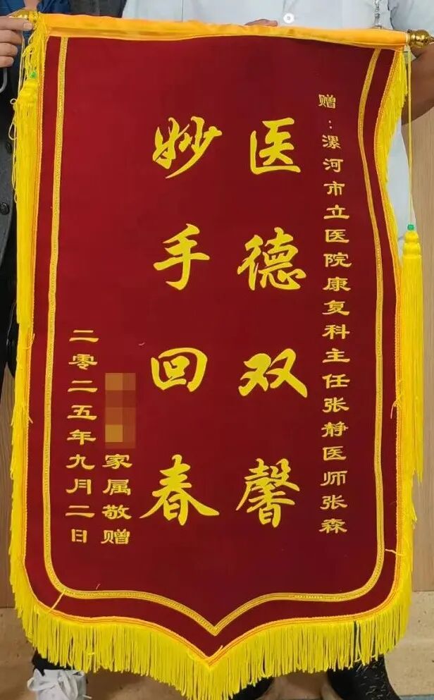 “医德双馨,妙手回春”——这面沉甸甸的锦旗,被患者郑重地送到了漯河医专二附院(漯河市骨科医院、漯河市立医院)康复医学科张森医生手中 ,这是患者对张医生真挚的肯定,更是一段从绝望到重生的康复之路的见证。 一个半月前,患者因偏瘫陷入困境:左侧肢体完全活动不利,神志不清、胡言谵语,沟通障碍,记忆功能受损,生活无法自理。康复医学科团队立即制定个性化方案,中西医结合开启康复征程。