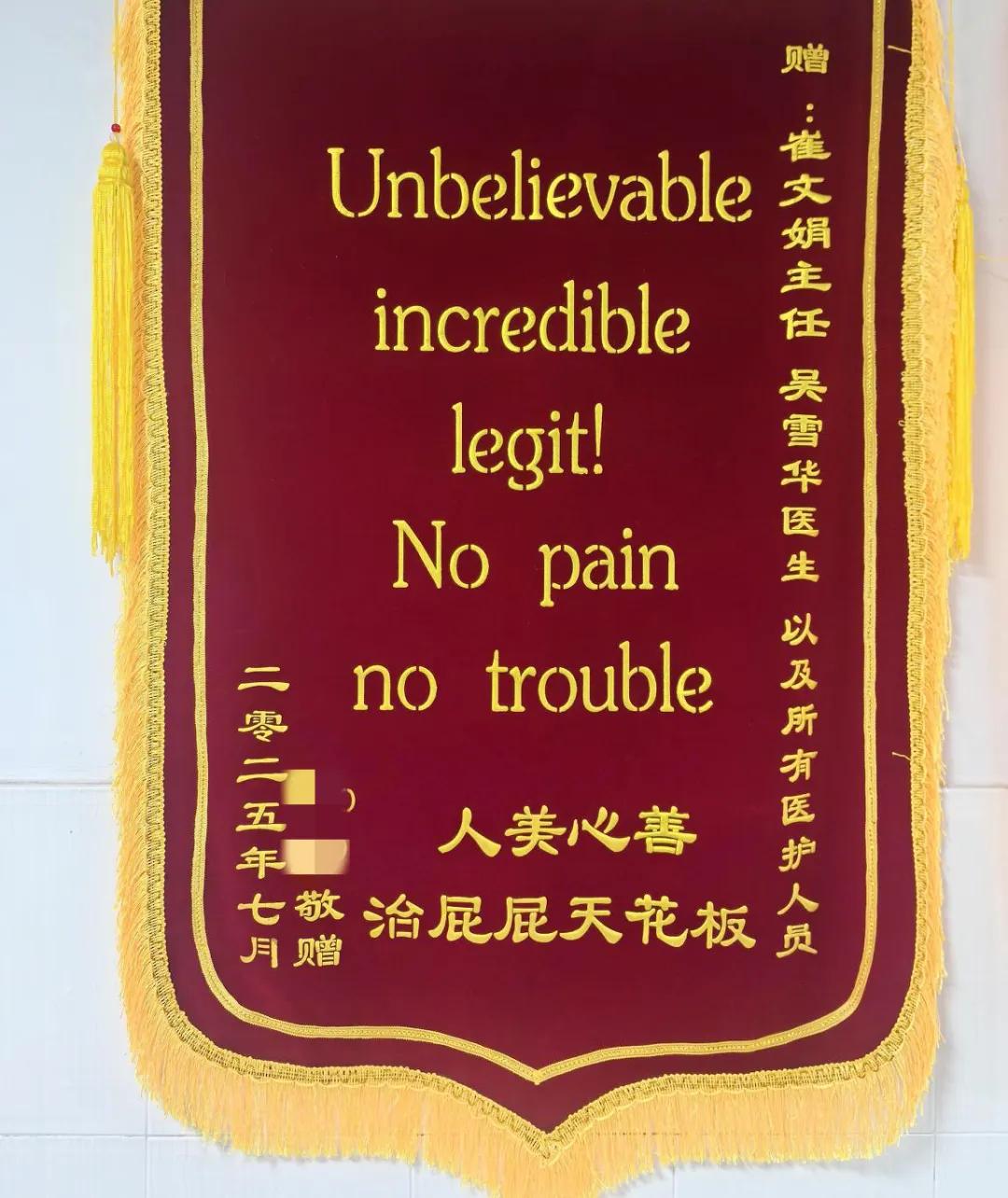 熟悉肛肠科的人都知道,这里时常因患者的 “巧思” 充满欢乐,近期科室就接连收到了好几面别具一格的锦旗。其中一面写着 “unbelievable incredible legit!no pain no trouble 人美心善 治屁屁天花板”,中西结合的表达既俏皮又真诚;还有一面则用 “手术不疼换药不疼,肛好有你高水平!” 的谐音巧语传递谢意。这些充满趣味的锦旗文字,从侧面印证了肛肠科在创面疼痛管理方面取得了良好成效,也是患者对我们诊疗服务的肯定认可。