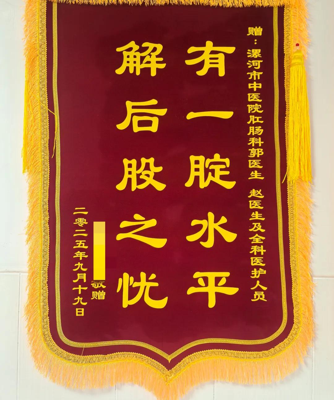 近日,一位肛周脓肿术后复查的患者,特意冒雨从外地赶来,将一面写着 “有一腚水平,解后股之忧” 的锦旗送到科室。此前,该患者因肛周脓肿饱受疼痛折磨,辗转多家医院仍未找到满意的治疗方案,最终选择了漯河市中医院肛肠科。在刘兵主任、崔文娟副主任、郭松杨主治医师、赵蕊住院医师及全体医护人员的共同努力下,经精心治疗与护理,患者术中术后无明显疼痛,就医体验舒心,几日前已顺利痊愈出院。
