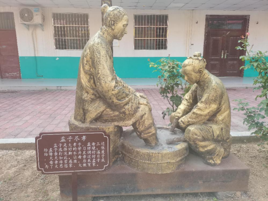 这是办公区域。二楼以上是学生宿舍,楼梯口处的花坛花开得鲜艳而浓烈;孟子尽孝的雕像立在这里,栩栩如生······