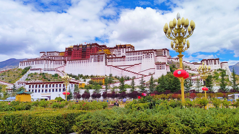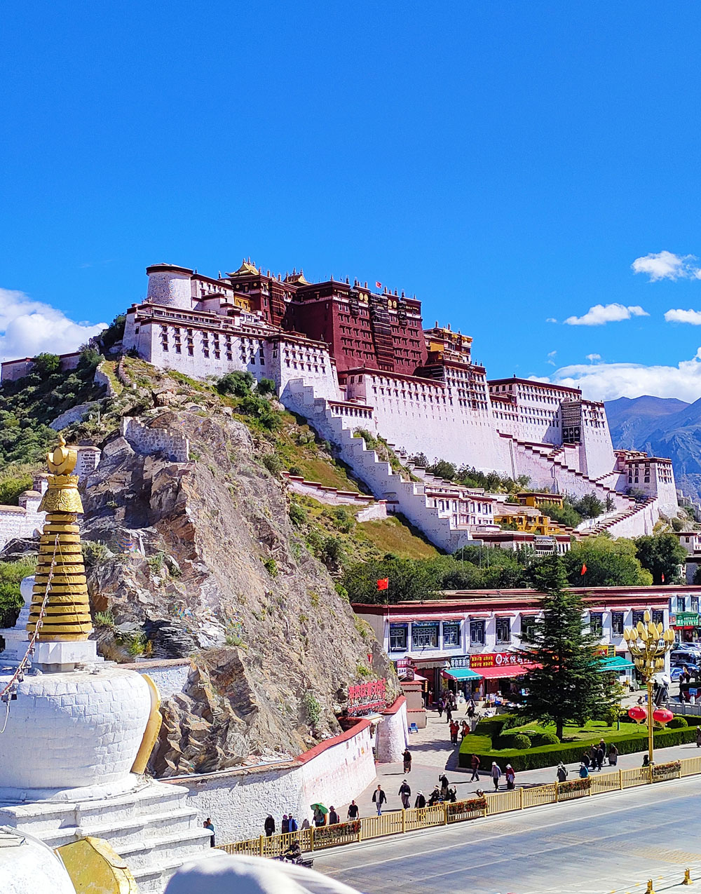 雄伟神奇的布达拉宫,位于拉萨市区西北的马布日山上,由吐蕃第33代藏王松赞干布于631年主持兴建,主楼高117米,房舍1267间,是集宫殿、灵塔殿、佛殿、行政办公机构等诸多功能的大型宫堡式建筑群,依山而建,气吞山河,可谓藏族古建艺术的精华。布达拉宫屹立千年,好像一尊大佛俯瞰着芸芸众生。参观布达拉宫需要网上预约,往年就有朋友自驾到拉萨,因预约不上而错过,留下一路遗憾。在布达拉宫大门口,同行团友中一壮年男子与十岁小女孩因高反流鼻血,导游让他们在广场上休息,但他们还是紧跟队伍拾阶而上,毕竟大老远来了,谁肯与布达拉宫失之交臂。爬上宫殿顶层平台,我问鼻孔还塞着纸团的小女孩感觉怎么样,他眨巴眨巴大眼睛调皮地说:“住进布达拉宫,我是雪域最大的王;流浪在拉萨街头,我是世间最美的情郎!”(六世达赖喇嘛苍央嘉措诗句),说罢双手食指在嘴角绕了一圈,做出盘绕胡须的动作,逗得人们哄然一笑。