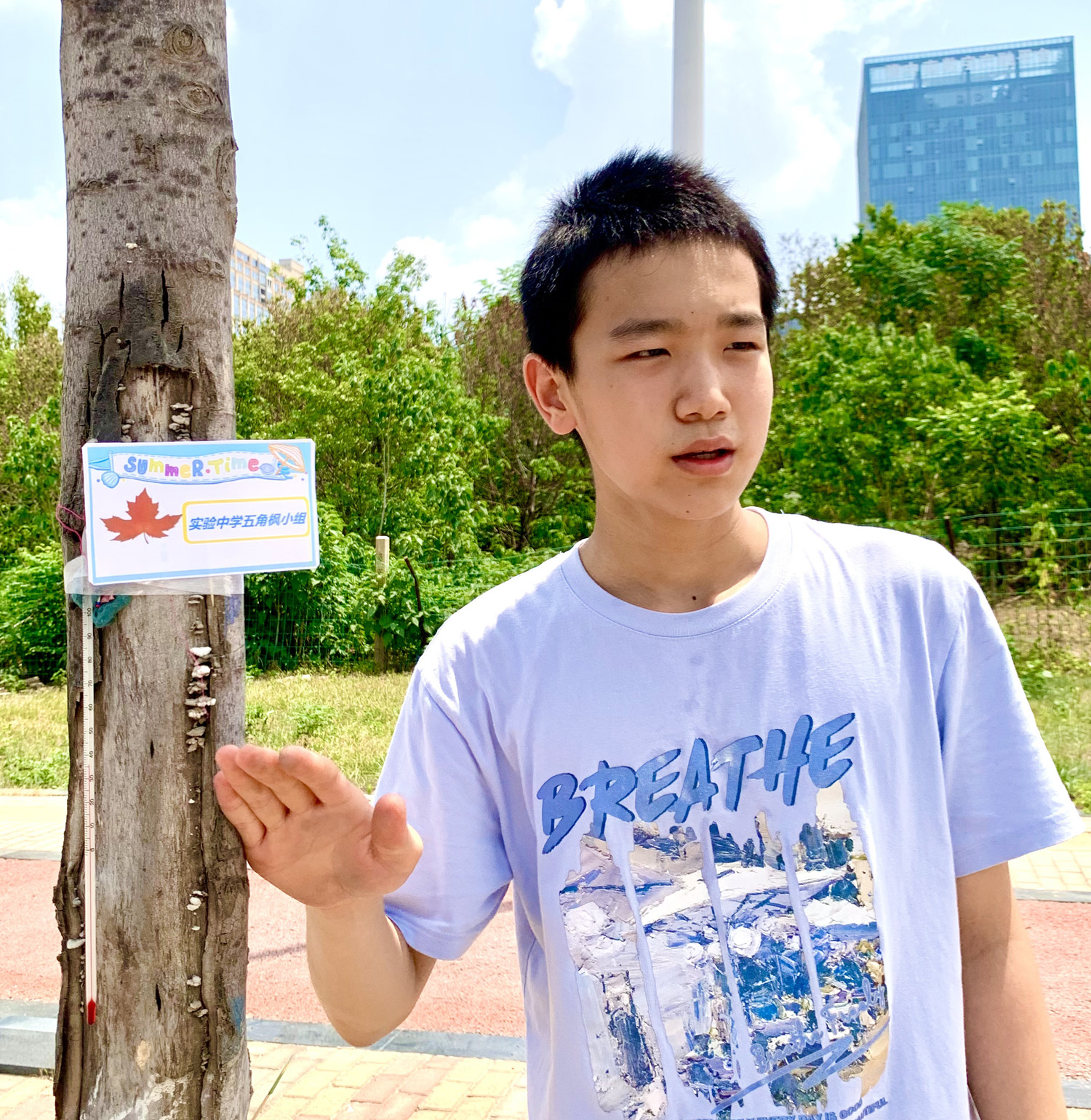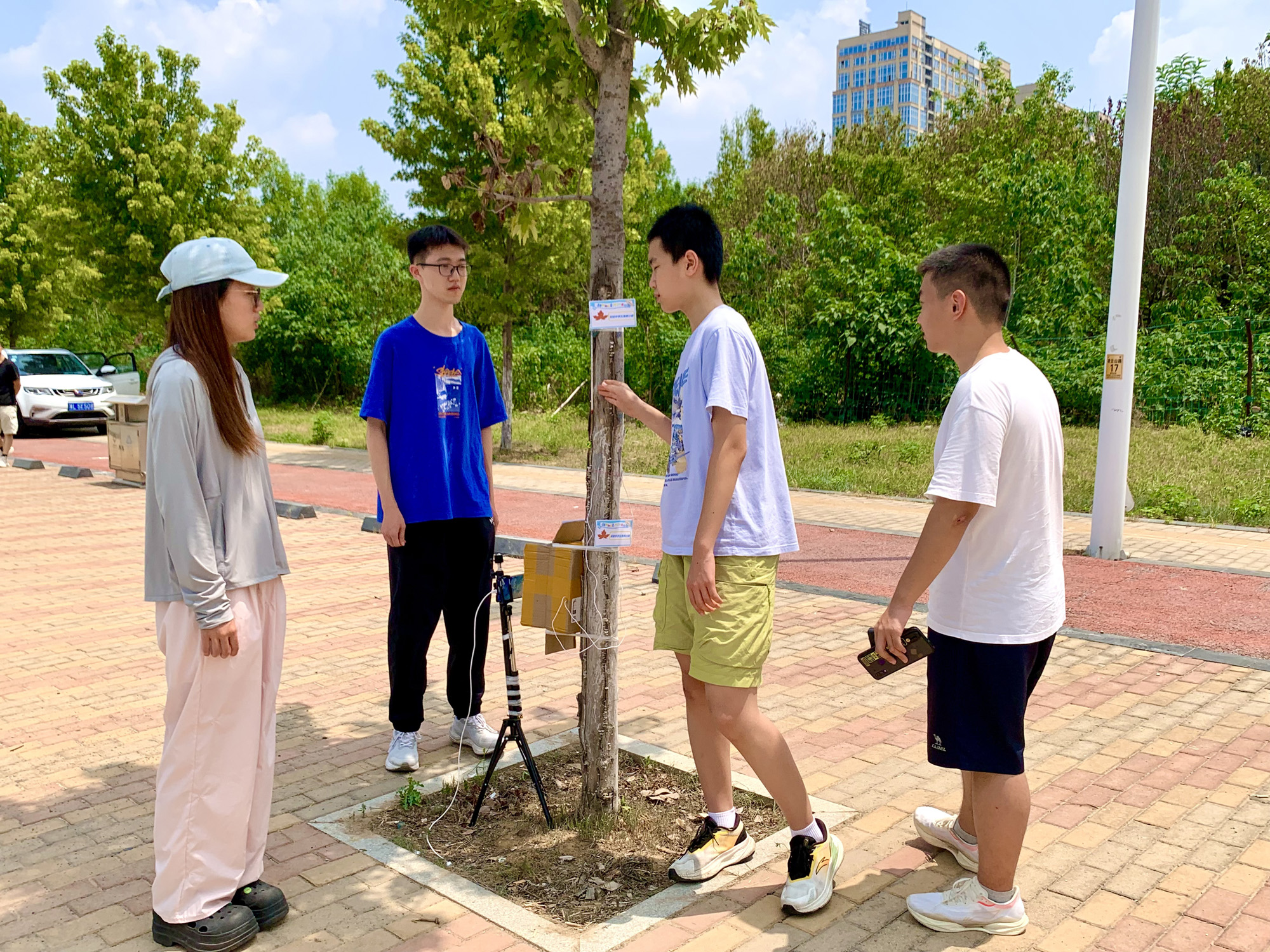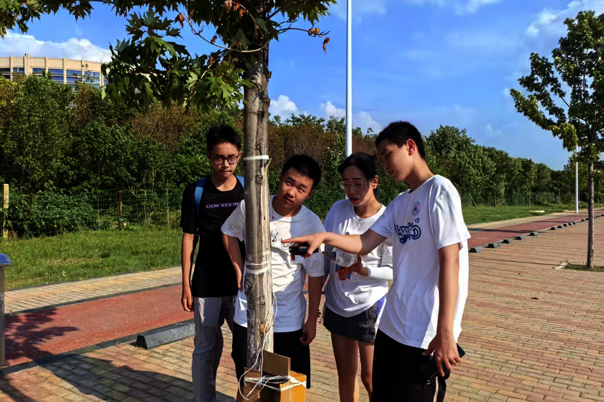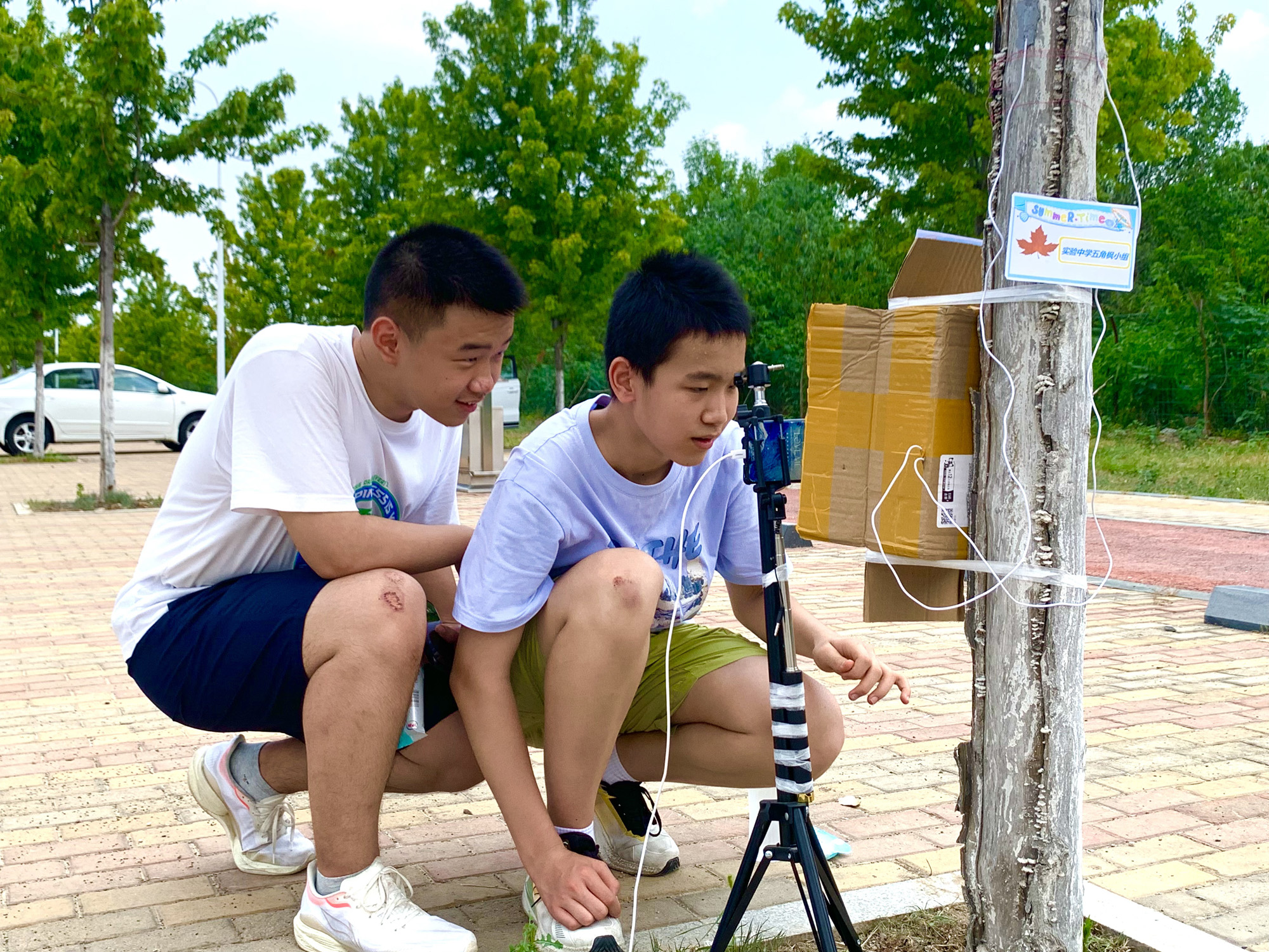7月18日午时,西城凌云山路,40℃的高温炙烤着大地。在炎炎烈日下,两个稚嫩的少年正蹲在一棵小树前,手里拿着仪器,专注地观察着什么。刺眼而毒辣的阳光洒在他们的身上,他们却仿佛感觉不到炎热与不适。