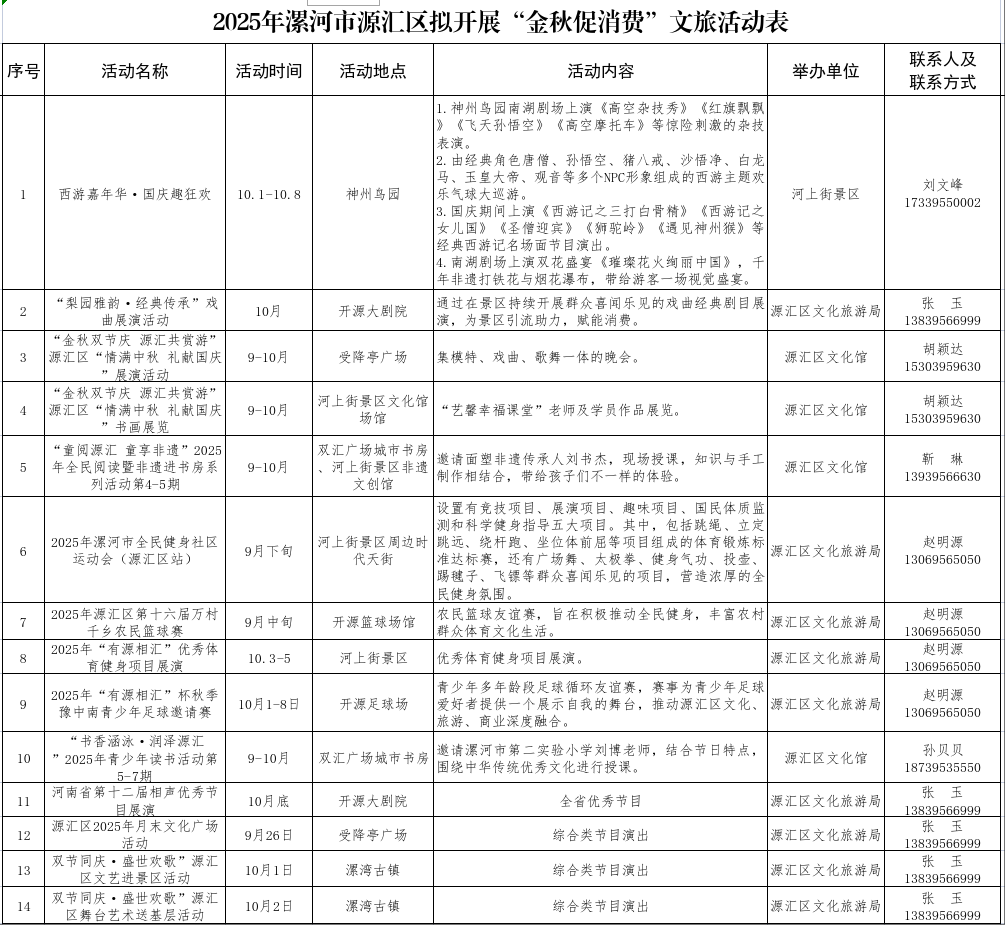 为深入贯彻落实国家、省、市关于促进文旅消费的决策部署,进一步激发全区文旅市场活力、提振消费信心、点燃群众消费热情,拉动文旅消费增长,源汇区文旅局采取三项有力措施,精心筹备并扎实推进金秋文旅消费季活动。