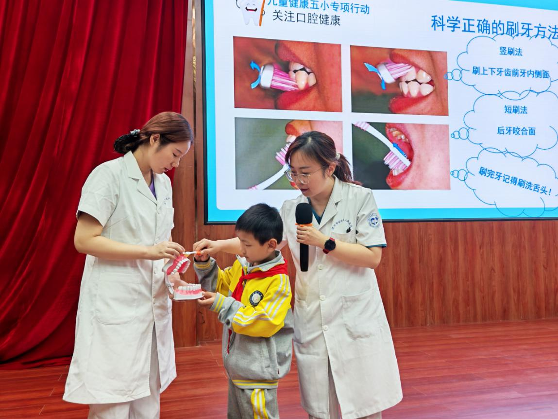 活动中,召陵区人民医院儿童保健科杨柳医生为孩子们带来了一节生动有趣的健康知识课。课堂上,同学们在杨医生的引导下积极互动,尤其是在刷牙规范讲解环节,少先队员们踊跃参与实操演示,在趣味学习中树立健康意识。这堂课程不仅传递了健康知识,更将党对少年儿童的关怀具象为可感可知的教育服务,让红色初心在健康育人中落地生根。