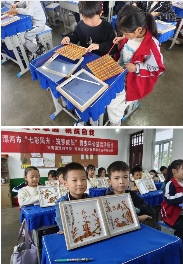 随后,在工作人员的指导下,孩子们将一根根彩色的竹篾穿插、交织,细心构图,耐心固定。不一会儿,一幅幅充满诗意的二十四节气竹编画陆续诞生——象征春分的燕子、代表谷雨的嫩芽、寓意小满的麦穗……巧手之下,四季的流转与节气的智慧在小小的画框中生动呈现。这个过程不仅锻炼了孩子们的动手能力与专注力,更让他们在创作中系统回顾和感知了二十四节气的整体画卷,亲身感受了传统竹编技艺的独特魅力。