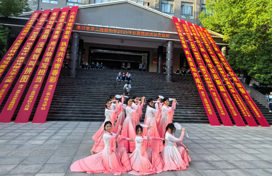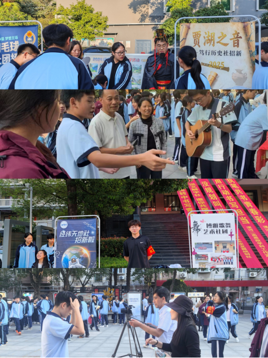 现场处处洋溢着热烈氛围,人潮穿梭不息,漯河市电视台记者也为本次社团招新活动采访拍摄记录。25个社团充分展现特色优势,各显神通、百舸争流——说文解字社现场开展“汉字趣味问答”,博雅歌舞艺术团带来清庭云月歌舞表演,风雅颂民乐团进行古筝弹奏等等。多样节目各具风格、精彩纷呈,既展现出漯河二高学子昂扬向上的青春风貌,更让社员们的蓬勃活力扑面而来,为招新活动注入了满满的青春气息。