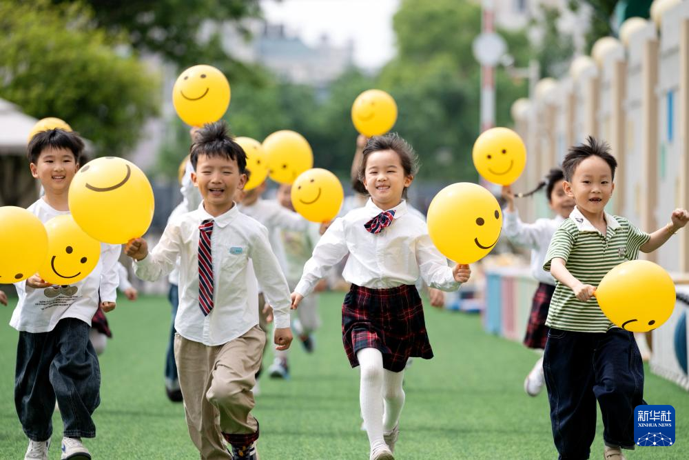 5月6日,浙江省湖州市长兴县实验幼儿园的孩子们手举笑脸气球,进行“笑脸赛跑”小游戏。