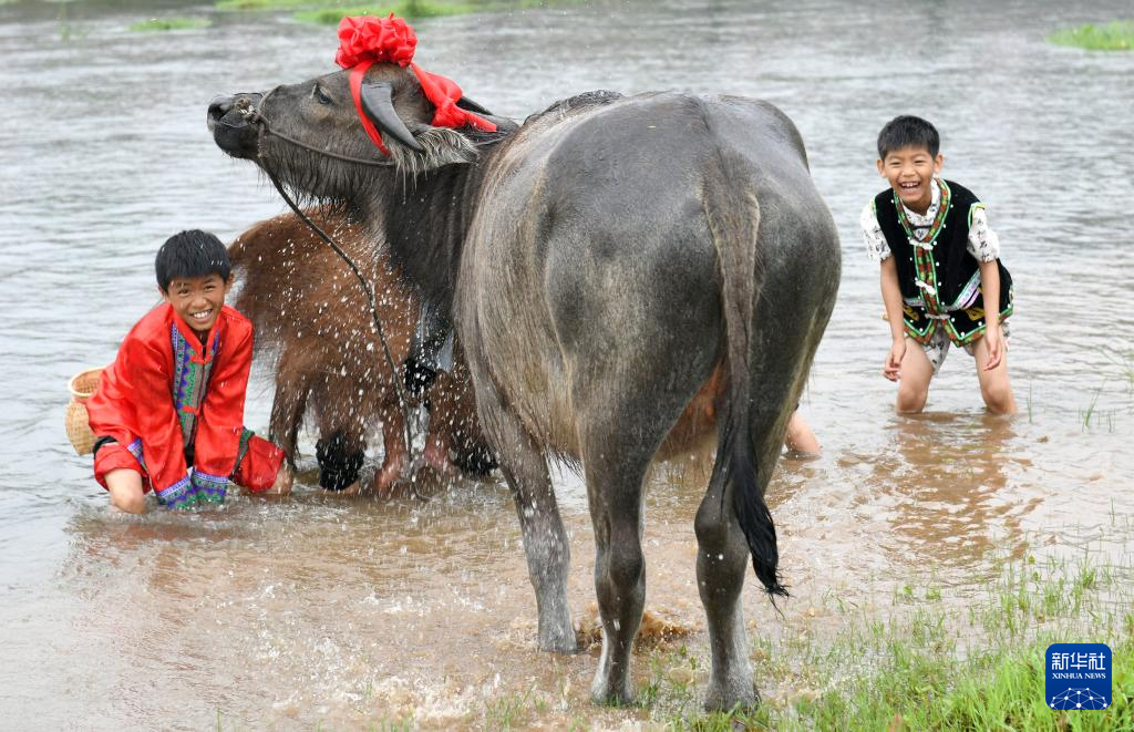 5月5日,在广东省清远市连山壮族瑶族自治县上帅镇东君村,身着壮族服饰的小朋友在中洲河里沐牛。