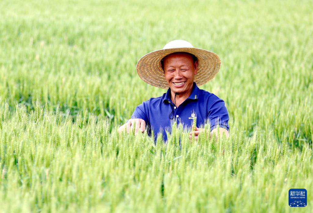 5月5日,山东省临沂市郯城县郯城街道陵坡村村民在田间查看小麦长势。