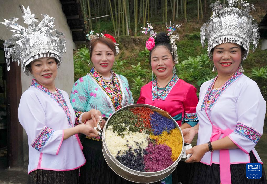 5月5日,在广西融水苗族自治县怀宝镇盘荣村,群众在展示五色饭。