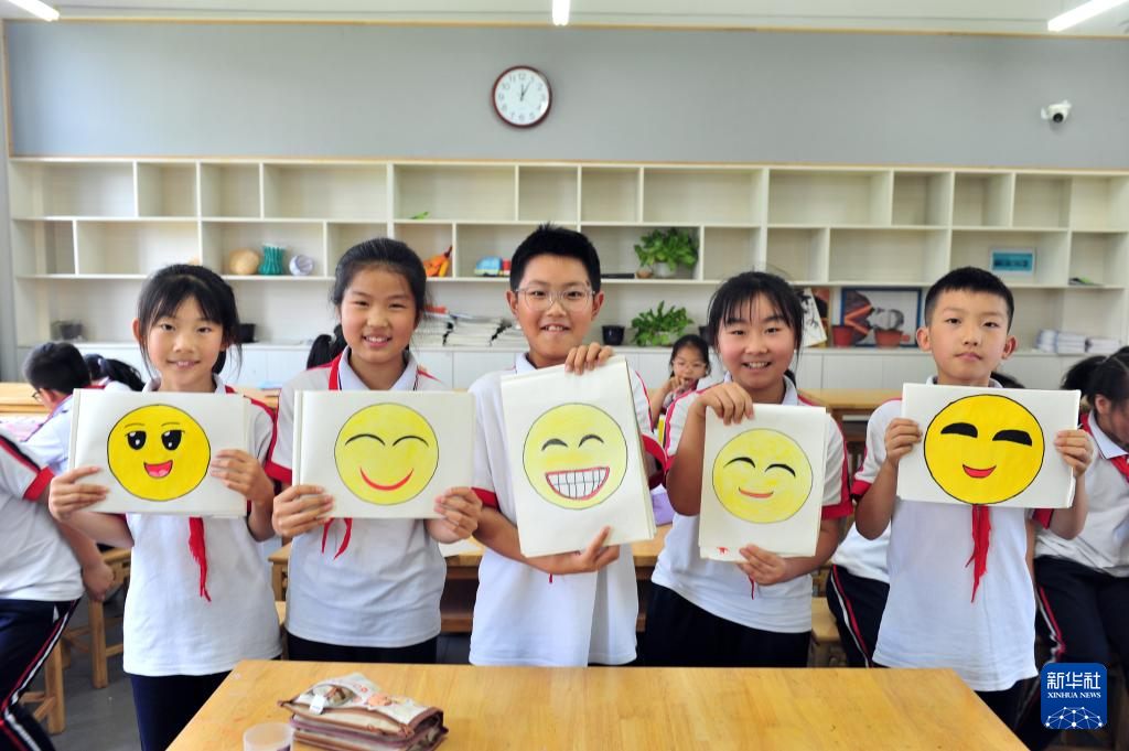 5月7日,湖北省宜昌市秭归县实验小学学生在美术课堂上展示自己创作的笑脸卡通美术作品。
