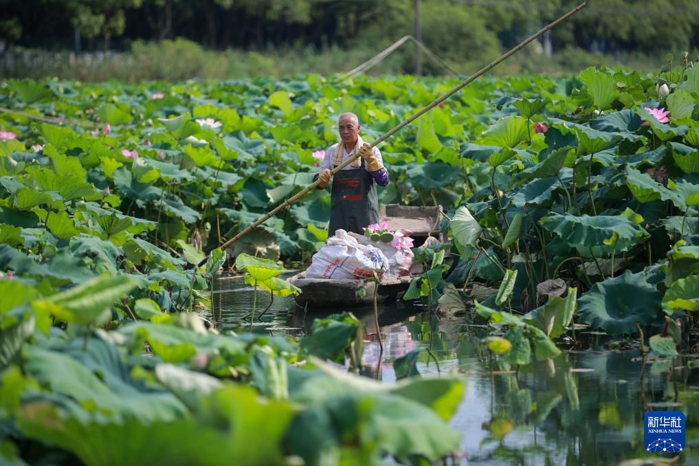 8月7日,农民在浙江省湖州市吴兴区埭溪镇官泽村采摘荷花和莲蓬。