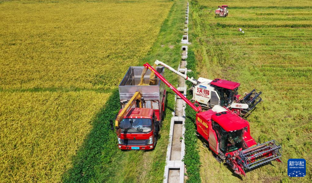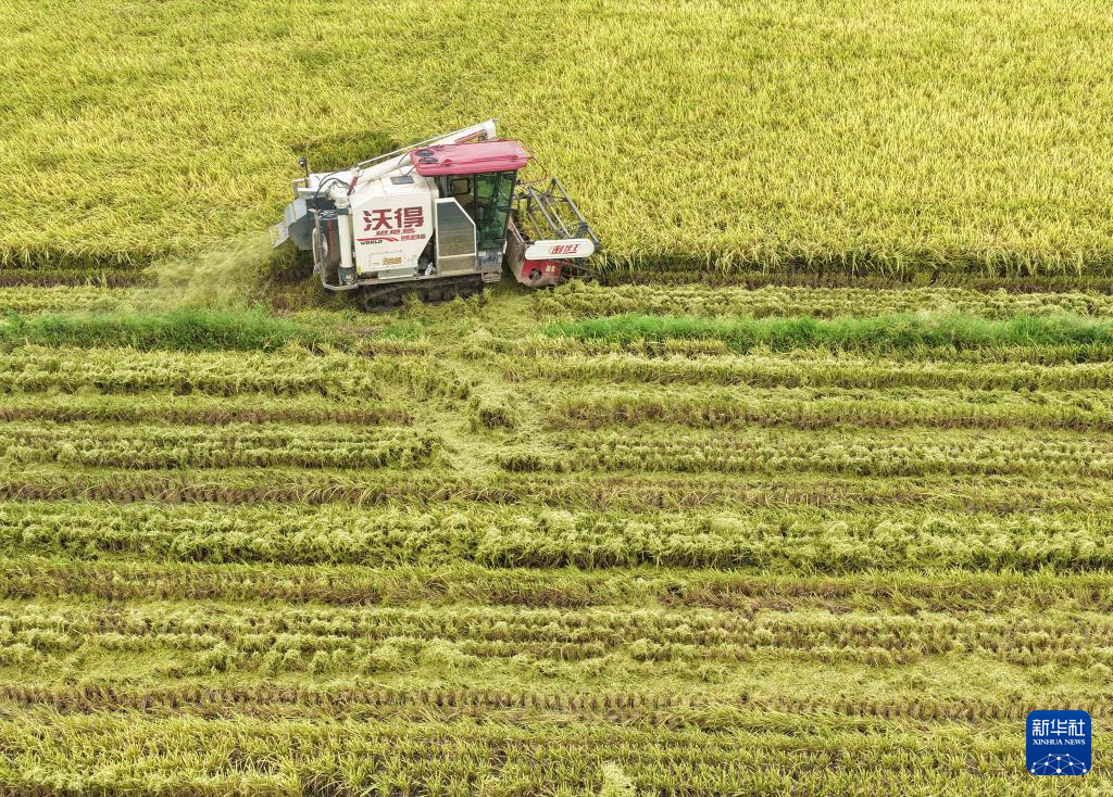 8月7日,在湖南省永州市道县寿雁镇社下村,农民驾驶农机收割水稻(无人机照片)。