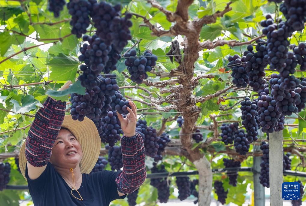 8月7日,果农在江苏省句容市白兔镇倪塘村一家葡萄园采摘葡萄。