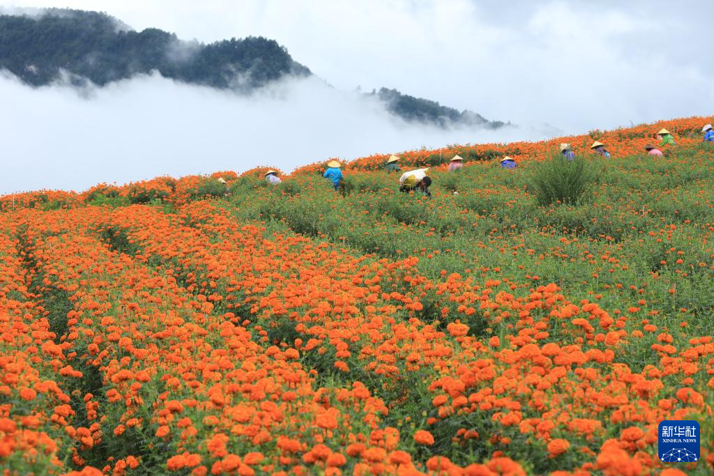 8月7日,在云南腾冲市固东镇,农民采收万寿菊。
