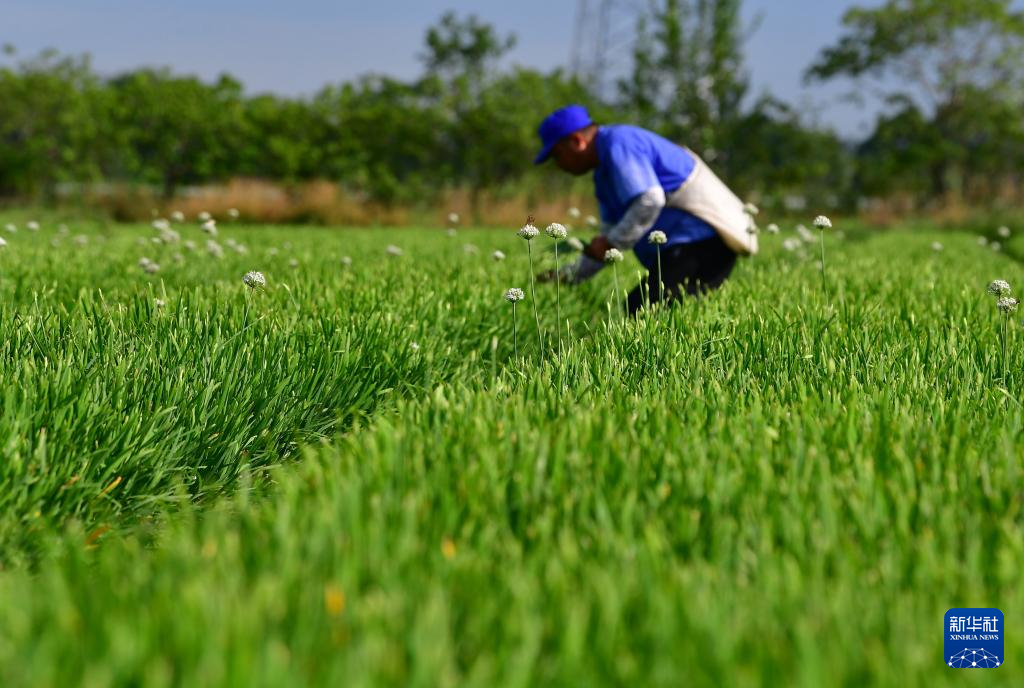 8月7日,采摘工在江苏省无锡市惠山区玉祁街道一处蔬菜种植基地采摘韭菜花。
