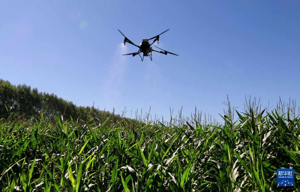 8月7日,在北大荒集团黑龙江格球山农场有限公司第二管理区,一架植保无人机为玉米喷施“营养液”。