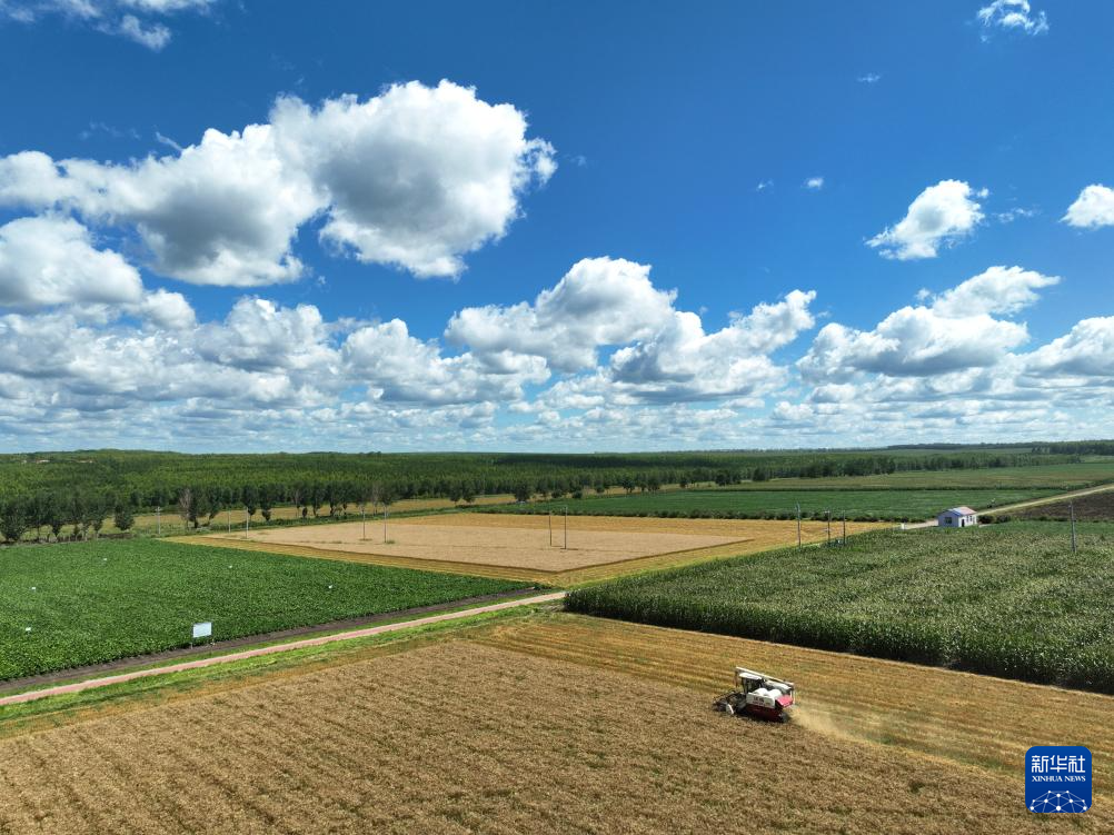8月7日,在黑龙江省农垦科学院九三科创中心,一台收割机在小麦繁殖田进行收获作业(无人机照片)。