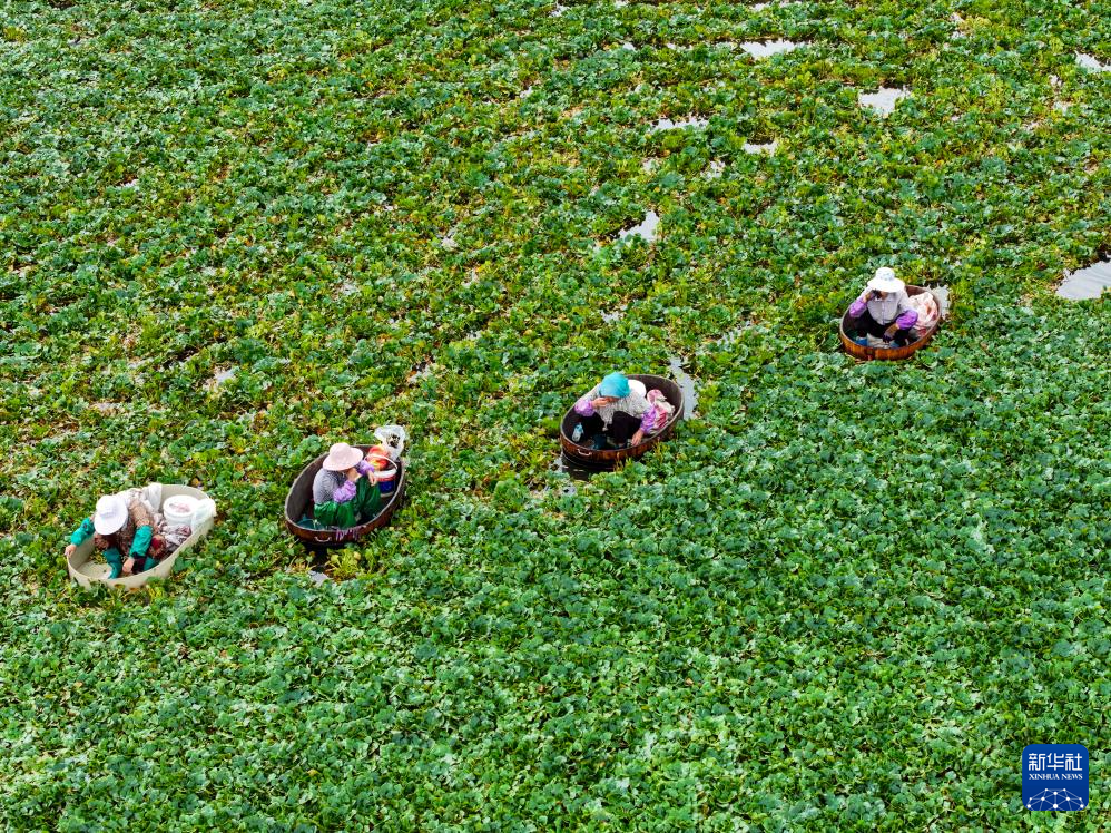 8月7日,江苏省泰州市海陵区苏陈镇张家院社区农民在菱塘采摘菱角(无人机照片)。
