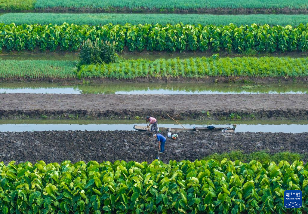 8月7日,农民在江苏省兴化市垛田街道高家荡村的田间劳作(无人机照片)。