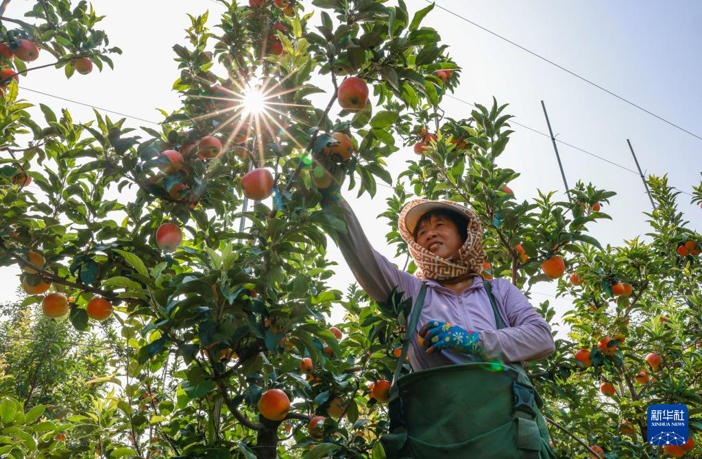 8月7日,果农在山东省东营市广饶县大王镇的一处苹果种植基地内采摘苹果。
