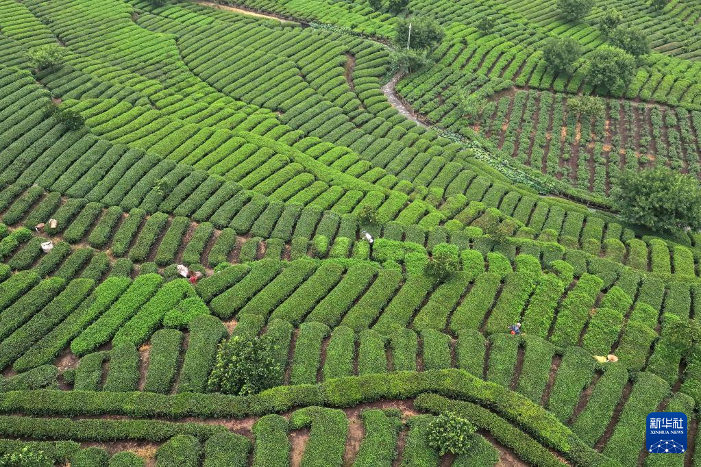 8月7日,茶农在三峡库区湖北省宜昌市秭归县茅坪镇松树坳村一茶园采摘秋茶(无人机照片)。