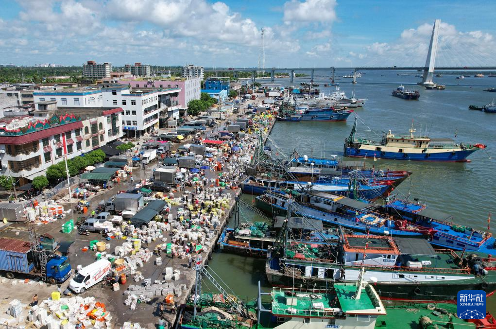在海南省文昌市清澜渔港码头,渔民和商贩在卸货、交易(8月21日摄,无人机照片)。