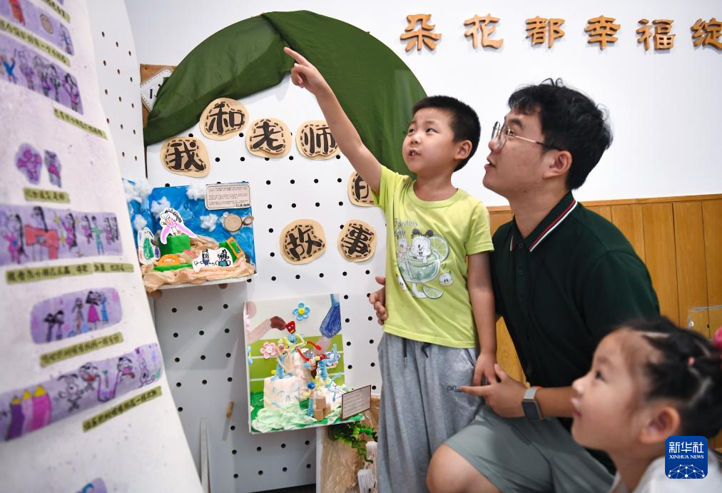 9月9日,在南京新世纪实验幼儿园,小朋友给老师讲述自己创作的“我和老师的故事”。