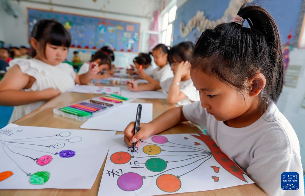 9月9日,河北省遵化市遵化镇南关幼儿园的小朋友在绘制美术作品感念师恩。