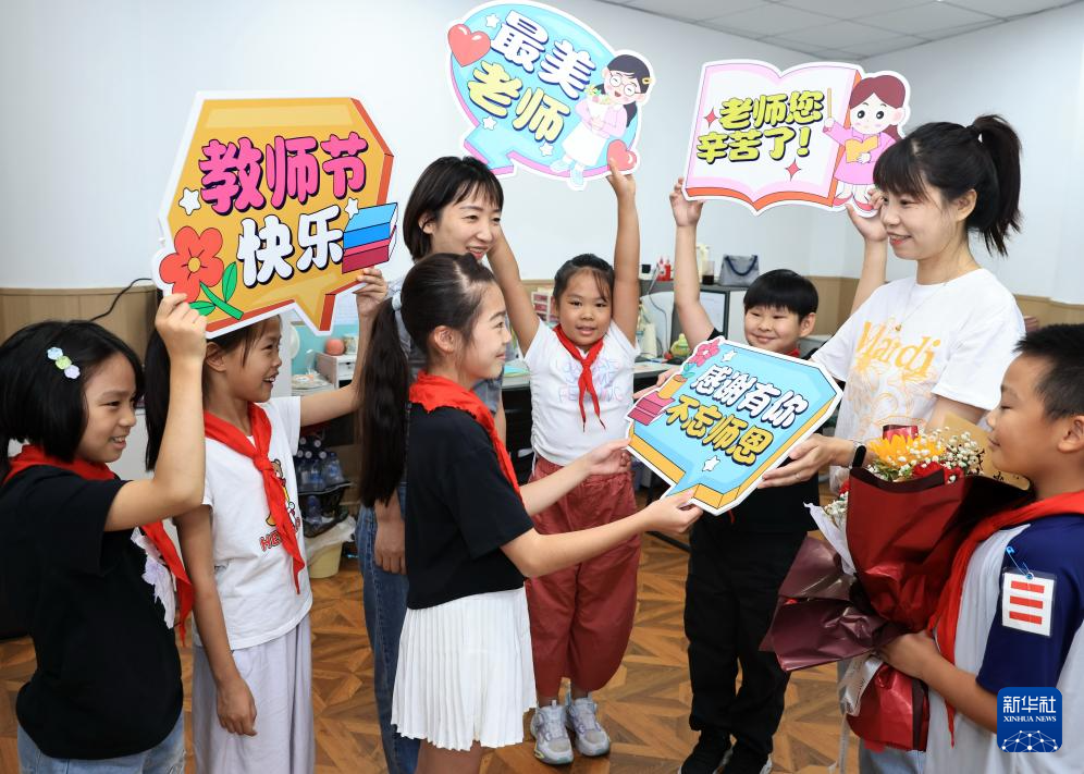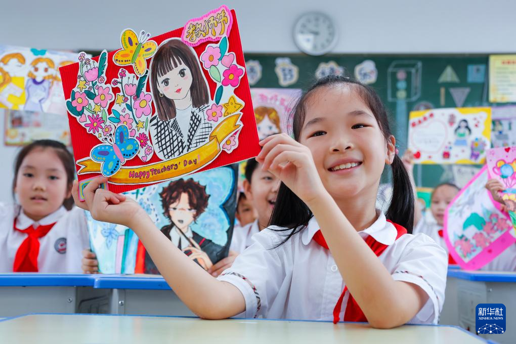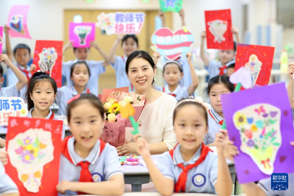 9月9日,在武汉市未来实验小学美林校区,学生为教师送上节日祝福。