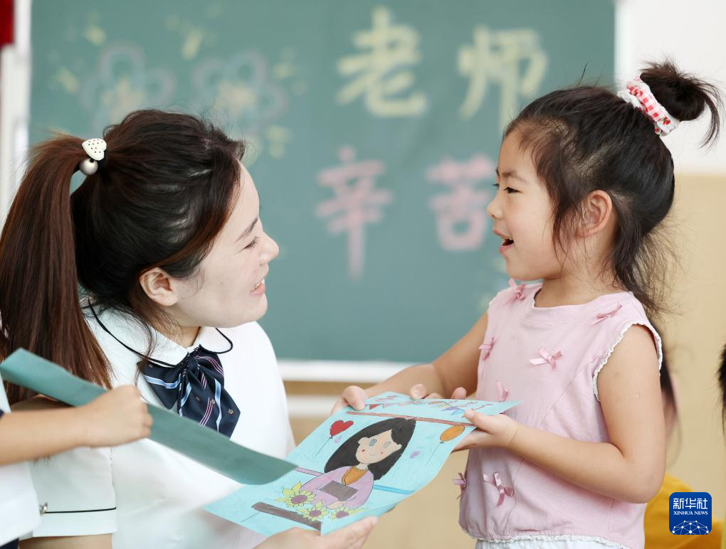 9月9日,山东省临沂市郯城县郯城街道官塘幼儿园的孩子将在老师的指导帮助下制作的绘画送给老师。
