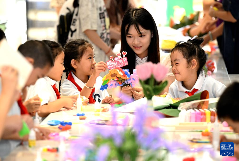 9月9日,在河北省石家庄市柏林庄学校开展的“黏土做花寄师恩”主题活动中,孩子们用粘土制作花束,为老师送上节日的祝福。