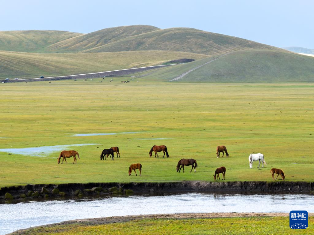 9月14日在内蒙古呼伦贝尔市陈巴尔虎草原拍摄的马群(无人机照片)。
