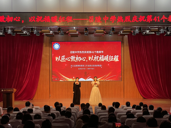 丹桂飘香满校园,师恩如歌润心田。2025年9月10日下午,召陵中学庆祝第41个教师节表彰大会在报告厅隆重举行。全体师生齐聚一堂,以最真挚的敬意与热烈的掌声,致敬耕耘在教育一线的园丁,共同唱响“以教育家精神铸魂强师,谱写教育强国建设华章”的时代主旋律。